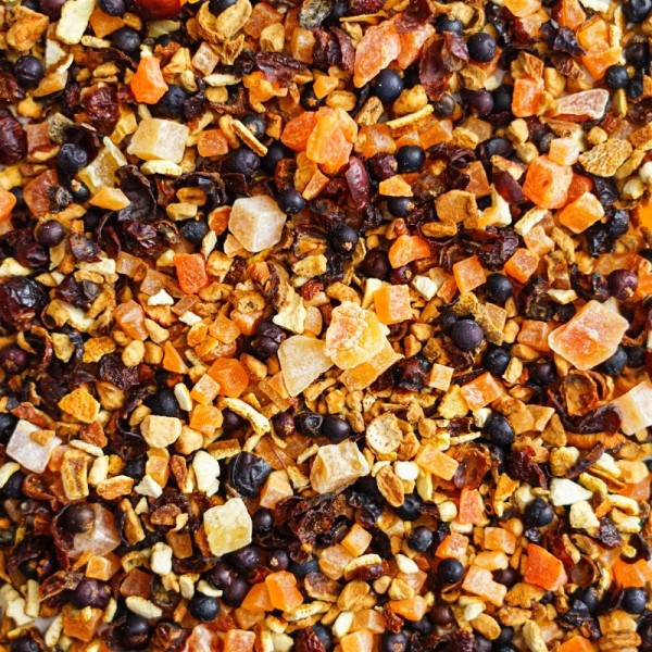 Состав: ягоды шиповника, кусочки яблока, ананаса и папайи, можжевеловая ягода, цедра апельсина.