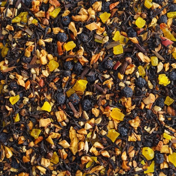 Ройбуш с добавлением кусочков яблока, ананаса, абрикоса, ягод рябины черноплодной, имбирём, корицей, кардамоном, гвоздикой и чёрным индийским чаем.