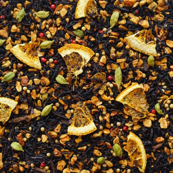 Чёрный чай с кусочками яблок, корицей, дольками апельсина, кориандром, кардамоном, гвоздикой и розовым перцем.
