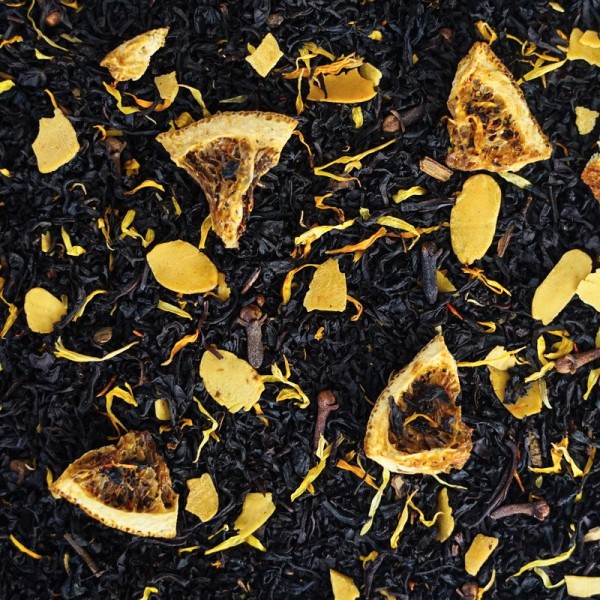 Черный чай, кусочки апельсина, сахарные звезды, миндаль, гвоздика, корица, ромовая приправа, лепестки цветов ноготков и чертополоха.