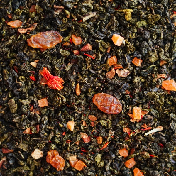 Зеленый чай с кусочками спелой груши, сладким изюмом, кубиками тропического ананаса, яркими лепестками сафлора и насыщенным сладко-фруктовым ароматом.
