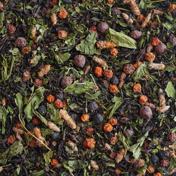 Чёрный индийский чай с добавлением ягод смородины, рябины красной и черноплодной, сосновых почек, боярышника, листов смородины и мяты.