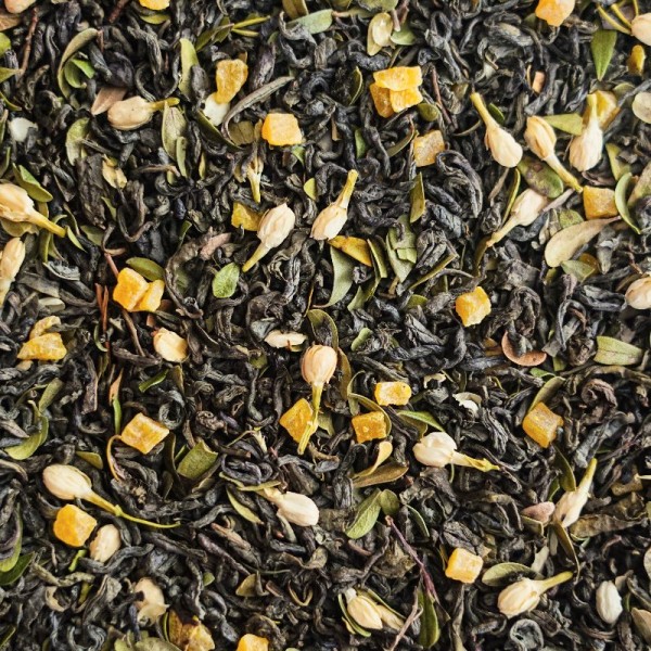Зелёный китайский чай с кусочками ананаса, бутонами жасмина и листочками брусники.