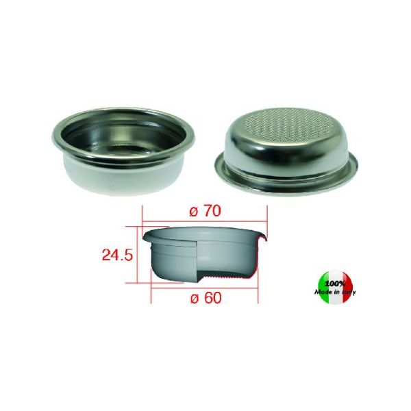 The shape was created by I.M.S. to obtain the proper ratio between the base and height of the coffee puck in relation to capacity. The filter is cylindrical with a specific corner rounding at the base. This shape has been designed to exploit the whole coffee puck, which also facilitates drying and expulsion.