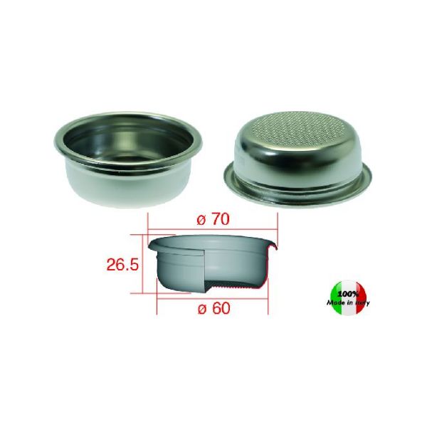 The shape was created by I.M.S. to obtain the proper ratio between the base and height of the coffee puck in relation to capacity. The filter is cylindrical with a specific corner rounding at the base. This shape has been designed to exploit the whole coffee puck, which also facilitates drying and expulsion.