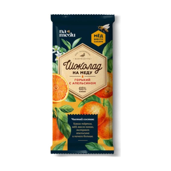 Шоколад NAMEDU «Горький с апельсином» 65% — это тёмный шоколад с ярким сочетанием насыщенного вкуса какао и освежающих цитрусовых ноток апельсина. В составе только натуральные ингредиенты: какао тёртое, мёд, масло какао и экстракт апельсина, что делает этот продукт более полезным и натуральным. Содержание какао 65% придаёт шоколаду мягкий, бархатистый вкус с лёгким цитрусовым послевкусием, а мёд заменяет сахар, добавляя естественную сладость.