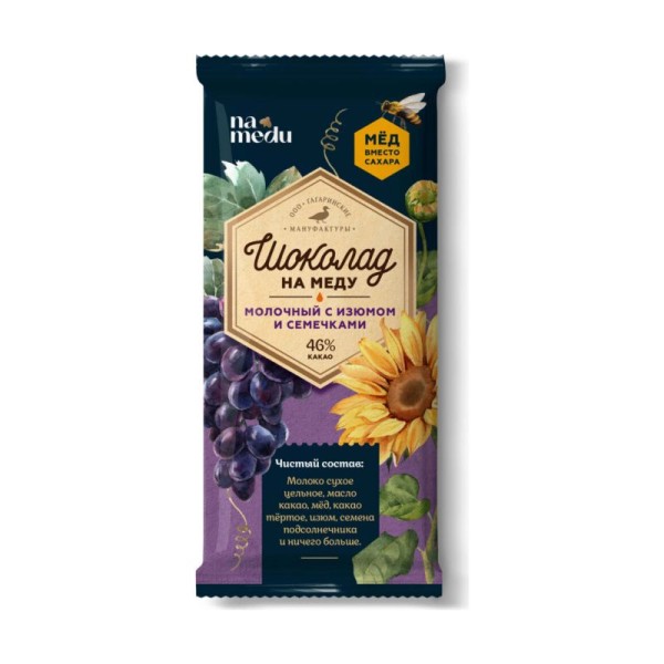 Шоколад NAMEDU «Молочный с изюмом и семечками» 46% — это удачное сочетание нежного молочного шоколада с натуральным изюмом и хрустящими семечками подсолнечника. В составе — только натуральные ингредиенты: какао тёртое, мёд, масло какао, сухое цельное молоко, изюм и семечки. Высокое содержание какао придаёт шоколаду насыщенный вкус, а изюм и семечки добавляют текстуре лёгкий хруст и приятное разнообразие.