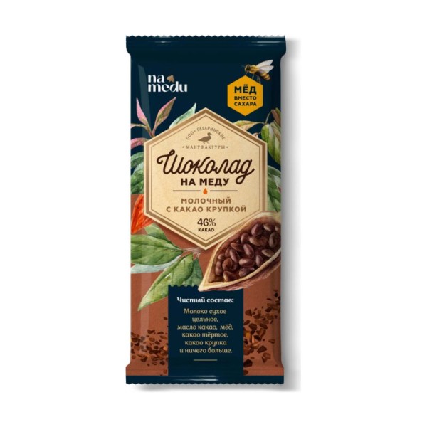 Шоколад NAMEDU «Молочный с какао крупкой» 46% — это насыщенный молочный шоколад с кусочками какао-крупки, которые добавляют хрустящую текстуру и подчёркивают природный вкус какао. Сочетание мягкости молочного шоколада и характерного аромата какао создаёт глубокий, многослойный вкус. Натуральный мёд придаёт сладость, не используя сахар, делая этот шоколад не только вкусным, но и более полезным вариантом.