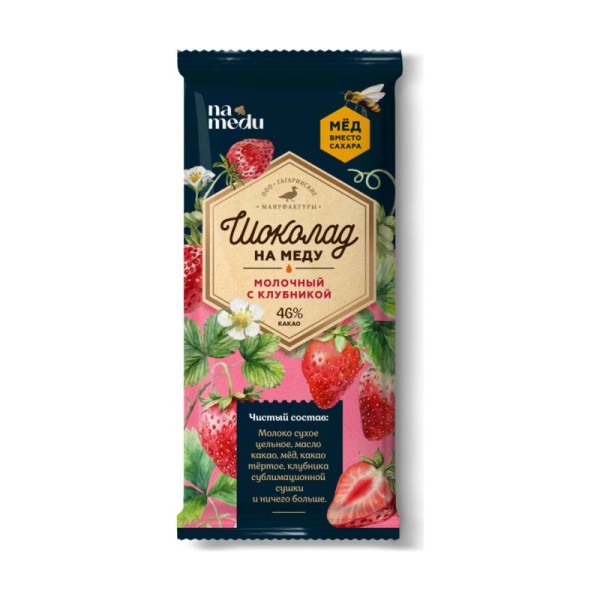 Состав: Молоко сухое цельное, масло какао, мёд, какао тёртое ,клубника сублимационной сушки