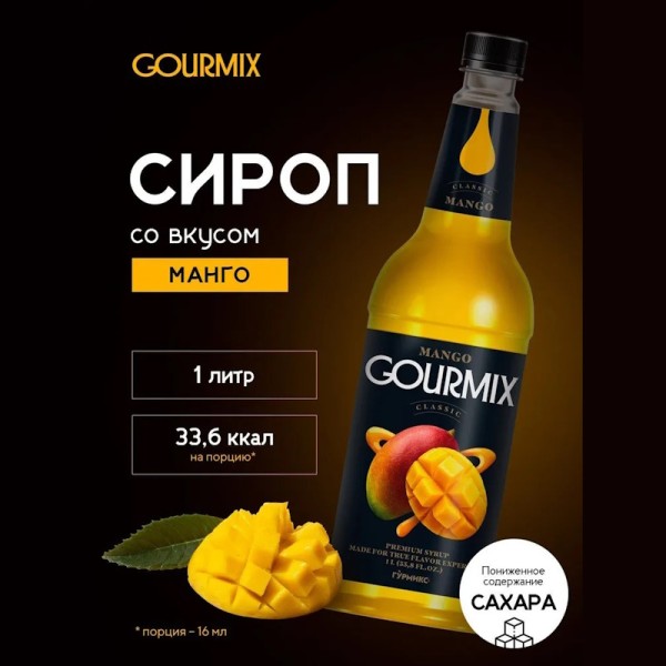 Сироп Манго производства Gourmix (Беларусь) используется для придания аромата и вкуса горячего кофе, чая, в лимонадах, мороженого, алкогольных и безалкогольных коктейлей. Подходит для различных предприятий общественного питаний, кофеен, ресторанов, баров и домашнего использования.