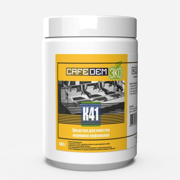 Средство для очистки жерновов кофемолок от кофейных масел CAFEDEM К41, 600 г Натуральное средство с эффективными очищающими свойствами для всех типов кофемолок. Для чистки жерновов кофемолок от остатков перемолотого кофе и устранения кофейного запаха. Состав: 100% органические ингредиенты (кукрузная мука), связующие компоненты. Таблетка желтоватого цвета, без запаха. Форма в таблетках обеспечивает идеальную дозировку чистящего средства. МЕРЫ ПРЕДОСТОРОЖНОСТИ: При надлежащем обращении опасные реакции отсутствуют, требование соблюдения правил личной гигиены. Беречь от детей !