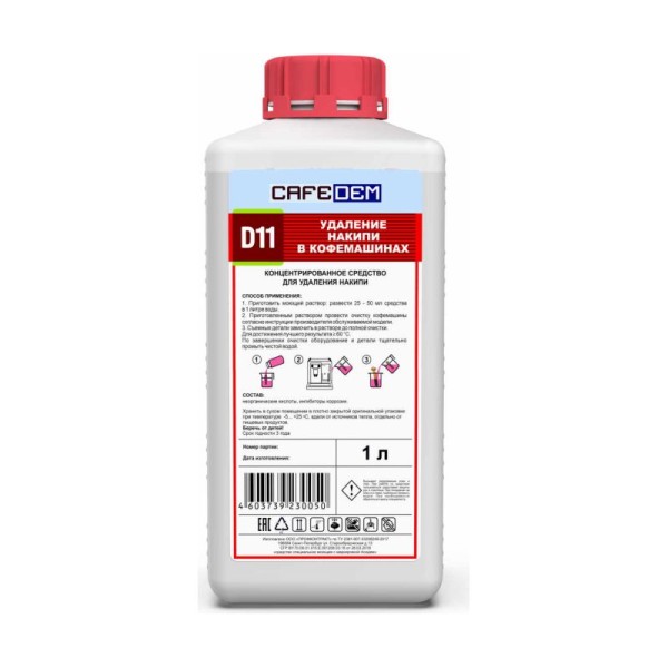 Концентрированное жидкое кислотное моющее средство CAFEDEM D11 предназначено для очистки оборудования от кальциевых отложений (накипи) из нагревательных элементов (в разных моделях аппаратов они могут быть представлены термоблоками, ТЭН, бойлерами) кофемашин. Средство не вызывает коррозии, быстро и полностью удаляет известковый налет и накипь с металлических частей оборудования.